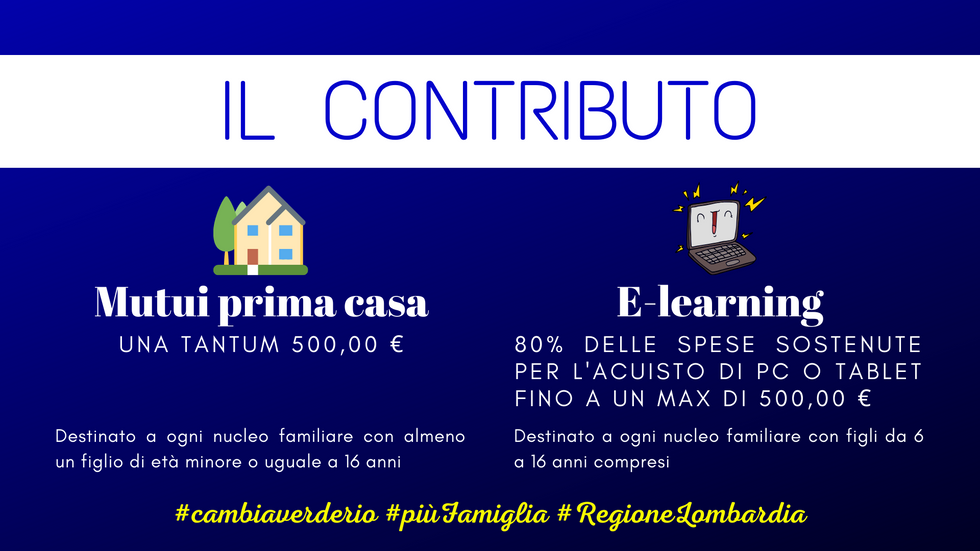 Di seguito delle slide esplicative che descrivono il bando che Regione Lombardia ha pubblicato a sostegno delle famiglie, nella fattispecie contributi per il mutuo di casa o per l'acquisto di dispositivi tecnologici utilizzati per l'e-learning
